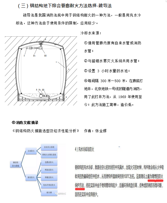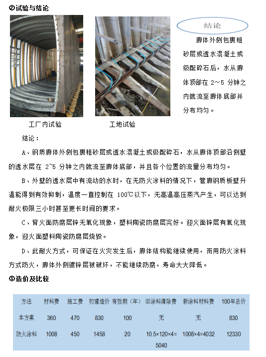 ⑨ 應(yīng)對(duì)耐火極限三小時(shí)的方式是涂耐火涂料,但耐火涂料壽命只有 10~20 年, 并且不能長(zhǎng)期耐潮,在壽命到期失效后重新涂刷時(shí),由于內(nèi)部管線及設(shè)施的存在, 清除殘余失效涂層的工作量大,涂刷新涂層更繁雜,費(fèi)用較初次施工時(shí)大大增加, 并且在管廊整個(gè)壽命周期內(nèi)要多次更換防火涂層;更為重要的是,耐火涂料只能阻止火災(zāi)時(shí)鋼結(jié)構(gòu)的溫度不高于 550℃,但對(duì)于鋼結(jié)構(gòu)地下管廊來說情況特殊,在火災(zāi)發(fā)生半小時(shí)左右,耐火涂料覆蓋的鋼結(jié)構(gòu)體溫度就超過 150℃,廊體外部土壤中的水份形成高溫高壓蒸汽,其產(chǎn)生的次生災(zāi)害有可能嚴(yán)重于火災(zāi)本身。